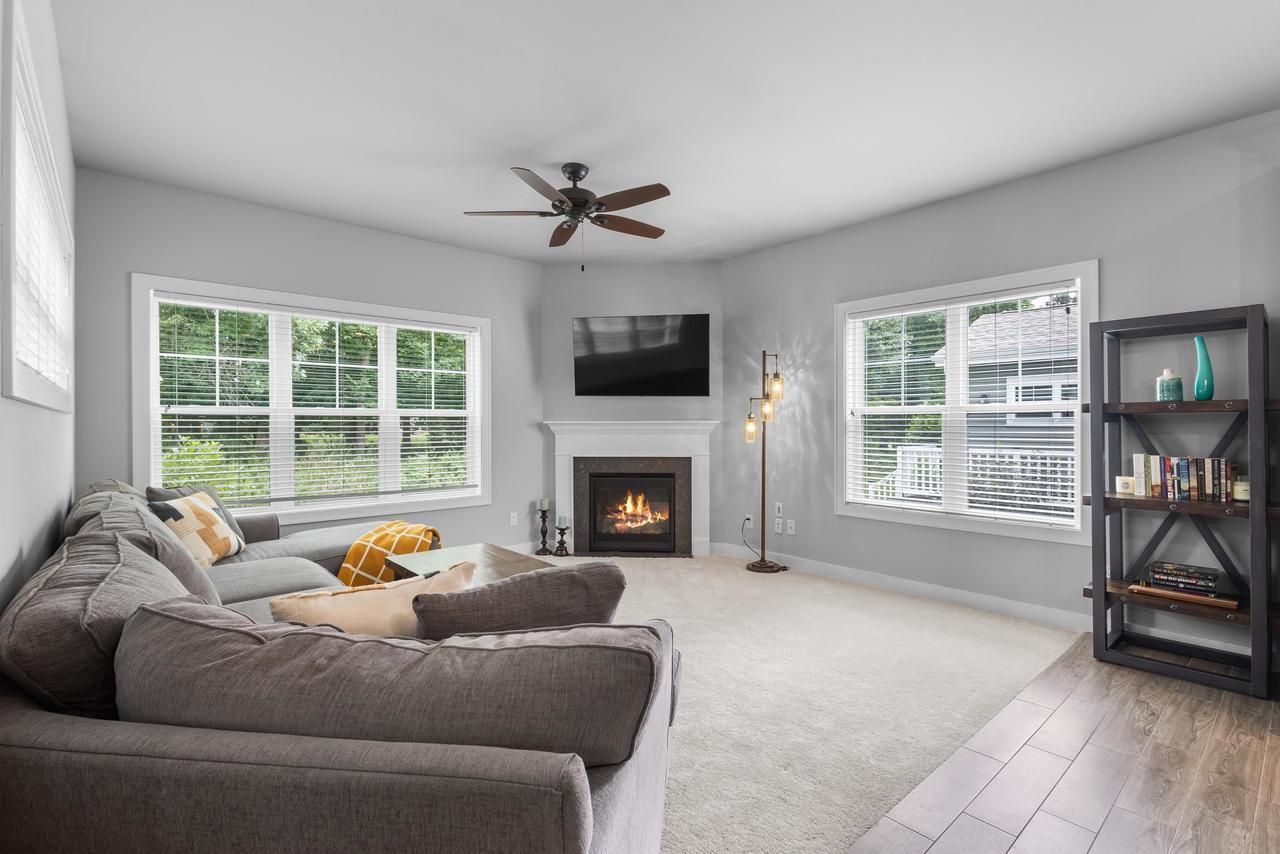 Corner-unit townhome backing to wooded green space, offering added privacy, natural light, and a finished lower level with exposure and full bathroom; a combination not commonly available. The open main-level features a bright living room with gas fireplace, dining area, and kitchen with updated appliances. A sliding door leads to a private deck overlooking the tree-lined green space behind the home. Upstairs has three bedrooms, including a primary suite with walk-in closet and private bath. Recent updates include new carpet, fresh interior paint, and new appliances. The finished lower level adds flexible living space, full bathroom, and areas suitable for a hangouts, home office, or guest space. An attached 2-car garage and ample storage round out the benefits. Conveniently located near shopping, dining, trails, and with easy access to Madison.